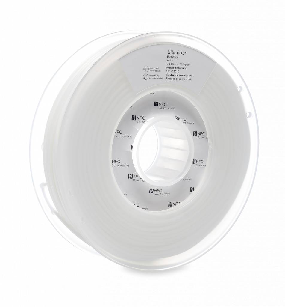 Voor degenen die ondersteunend materiaal nodig hebben dat niet hoeft te worden afgebroken : Ultimaker Breakaway Material voor het 3D printen van ondersteuningsstructuren. Dit speciaal voor 3D-printen op Ultimaker3 gemaakt 3D-printers ondersteunend materiaal op betrouwbare wijze kan worden verwerkt en zorgt voor een goede afdruk resultaten met uw 3D-printer en met alle grote 3D-printen materialen. Ultimaker Breakaway Filament kan gemakkelijk worden uitgebroken na verwerking en laat mooie oppervlakken achter. Ultimaker Breakaway kan worden gebruikt met PLA-, ABS-, CPE- en nylonfilamenten van Ultimaker. De vochtopname van dit materiaal is aanzienlijk lager dan bij PVA-materiaal. Het speciale aan deze filament:Er zit een NFC-chip op de spoel waardoor de Ultimaker 3 het ingeklemde Breakaway-materiaal direct kan detecteren!